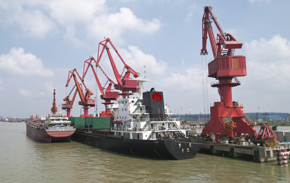 南京航運公司貨船正在港口裝運煤炭。(李曉亮 攝)